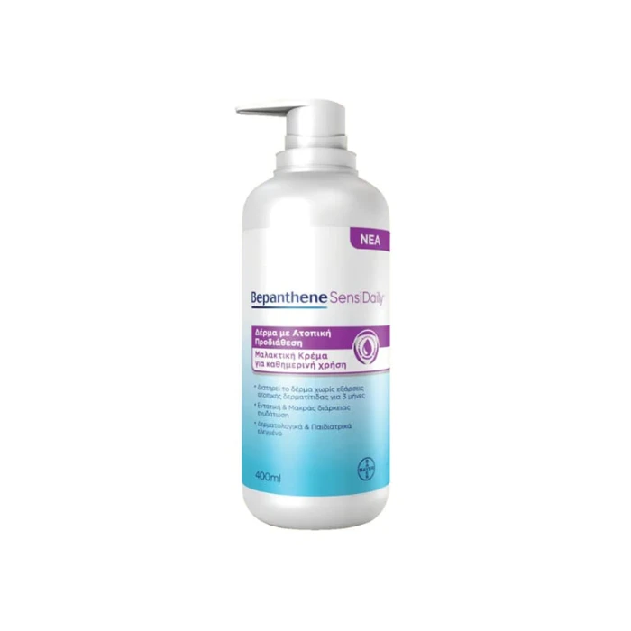 Η Bepanthene SensiDailyTM είναι μια μαλακτική κρέμα για σώμα & πρόσωπο που παρέχει αποτελεσματική και μακράς διάρκειας ενυδάτωση του δέρματος με ατοπική προδιάθεση. Κλινικά αποδεδειγμένα διατηρεί το βρεφικό δέρμα χωρίς εξάρσεις για τουλάχιστον 3 μήνες και είναι κατάλληλη για χρήση σε βρέφη, παιδιά και ενήλικες.