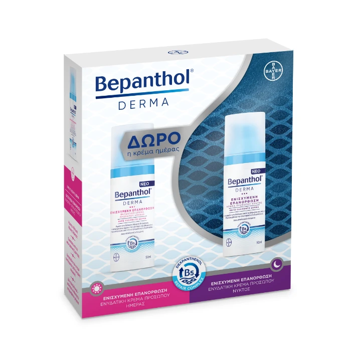 Ενυδατώστε και καταπραΰνετε την αίσθηση τραβήγματος στο δέρμα με την Bepanthol® Derma Ενυδατική Κρέμα Προσώπου Ημέρας για Ενισχυμένη Επανόρθωση και απολαύστε άμεση ενυδάτωση 48ώρης διάρκειας. Με πλούσια, μη-λιπαρή σύνθεση που έχει σχεδιαστεί για να ενισχύει τον επιδερμικό φραγμό και να παρέχει προστασία όλον τον χρόνο στο ξηρό ευαίσθητο δέρμα. Η Bepanthol® Derma Ενυδατική Κρέμα Προσώπου Ημέρας για Ενισχυμένη Επανόρθωση παρέχει άμεση ανακούφιση στην ξηρή επιδερμίδα και καταπραΰνει τον κνησμό του δέρματος από την πρώτη εφαρμογή. Η ειδική σύνθεσή της ενεργεί στη βασική αιτία της ξηροδερμίας, υποστηρίζοντας τη μακράς διάρκειας ενυδάτωση και προστασία της επιδερμίδας. Το ειδικό σύμπλεγμα επανόρθωσης Repair Complex περιέχει θρεπτικά συστατικά που συμβάλλουν στην ανάπλαση της επιδερμίδας σας και αναπληρώνουν τα φυσικά επίπεδα υγρασίας της.
