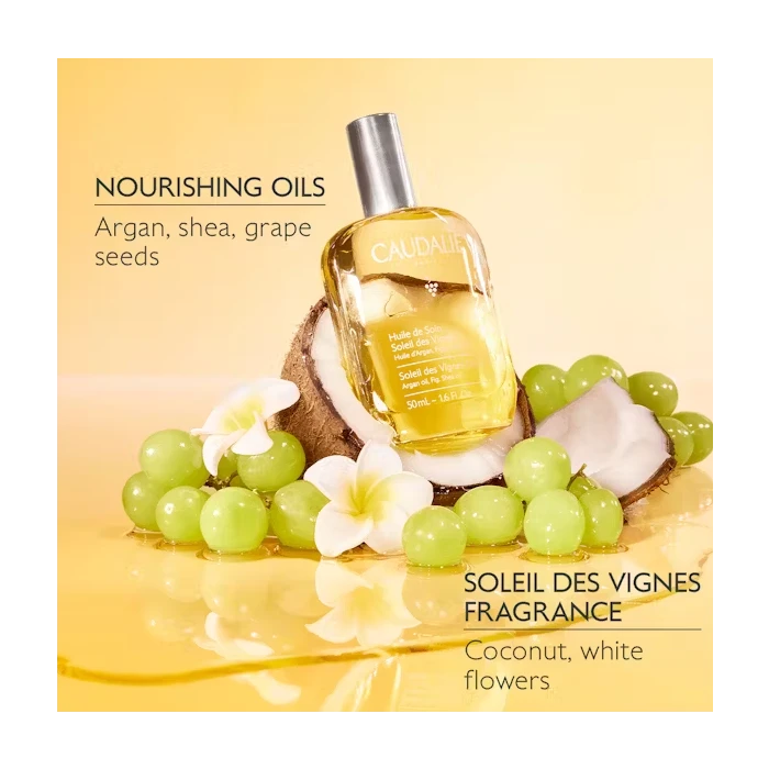 Το Soleil des Vignes Oil Elixir είναι ένα θρεπτικό έλαιο για το σώμα. Εμπλουτισμένο με έλαιο αργκάν, καριτέ, κουκούτσι σταφυλιού και αμυγδαλέλαιο, βελτιώνει την ελαστικότητα της επιδερμίδας και αποκαλύπτει μια όμορφη στιγμιαία λάμψη.