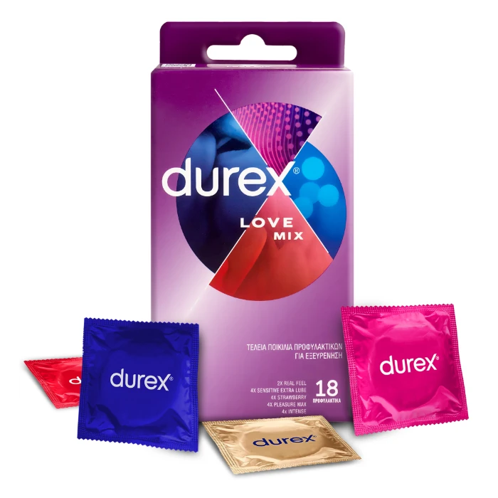 Τα προφυλακτικά Love Mix είναι μια μίξη απο προφυλακτικά Durex Pleasure Max , Durex Sensitive, Durex Total Contact, Durex Strawberry με γεύση φράουλα και Durex Intense. Στη συσκευασία περιέχονται προφυλακτικά διαφορετικού πάχους και σχήματος έτσι ώστε να χρησιμοποιήσετε εκείνο το προφυλακτικό που σας ταιρίαζει καλύτερα , ανάλογα με τη διάθεσή σας.