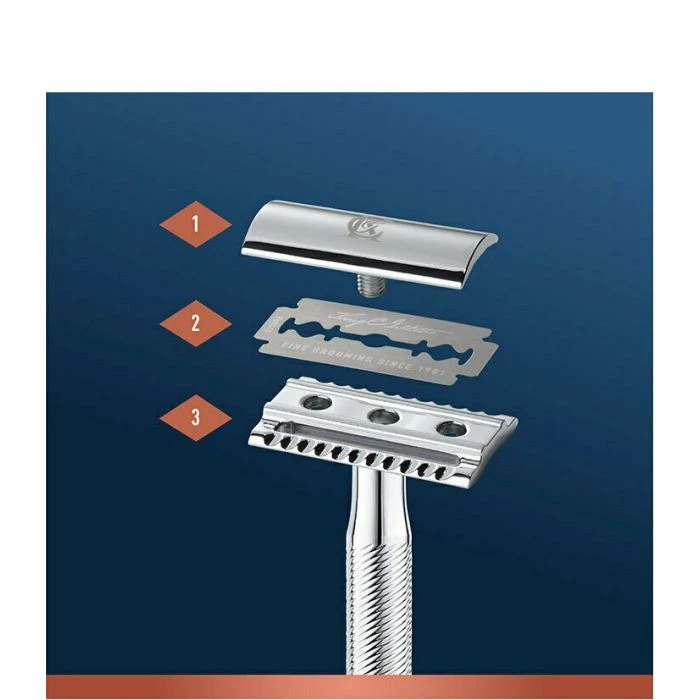 Το προστατευτικό κάλυμμα κρατάει στη θέση της τη λεπίδα διπλής ακμής, η οποία είναι κατασκευασμένη από ανοξείδωτο ατσάλι με επίστρωση πλατίνας για μεγαλύτερη διάρκεια και για πιο άνετο ξύρισμα χωρίς τραβήγματα.