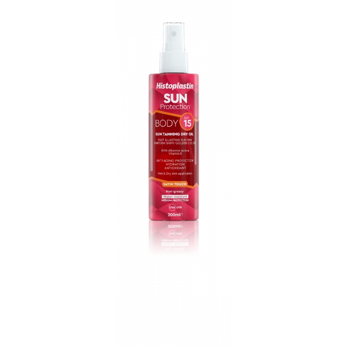 Το Histoplastin SUN PROTECTION TANNING DRY OIL BODY SATIN TOUCH SPF15 είναι ξηρό λάδι για γρήγορο, λαμπερό και έντονο μαύρισμα που διαρκεί. Η σύνθεση Satin Touch απορροφάται άμεσα. Προσφέρει αόρατη, μεταξένια υφή στο δέρμα. Βασίζεται στην τεχνολογία Alkannin Active Technology και προσφέρει τη νέα ολοκληρωμένη 360ᵒ αντηλιακή προστασία.