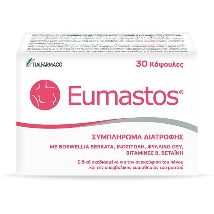 To Eumastos® είναι ένα εξειδικευμένο συμπλήρωμα διατροφής, ειδικά σχεδιασμένο για την ανακούφιση της υπερβολικής ευαισθησίας και της δυσφορίας του μαστού, του αισθήματος «βάρους» ή και καύσου καθώς και του πόνου του μαστού (μασταλγία).