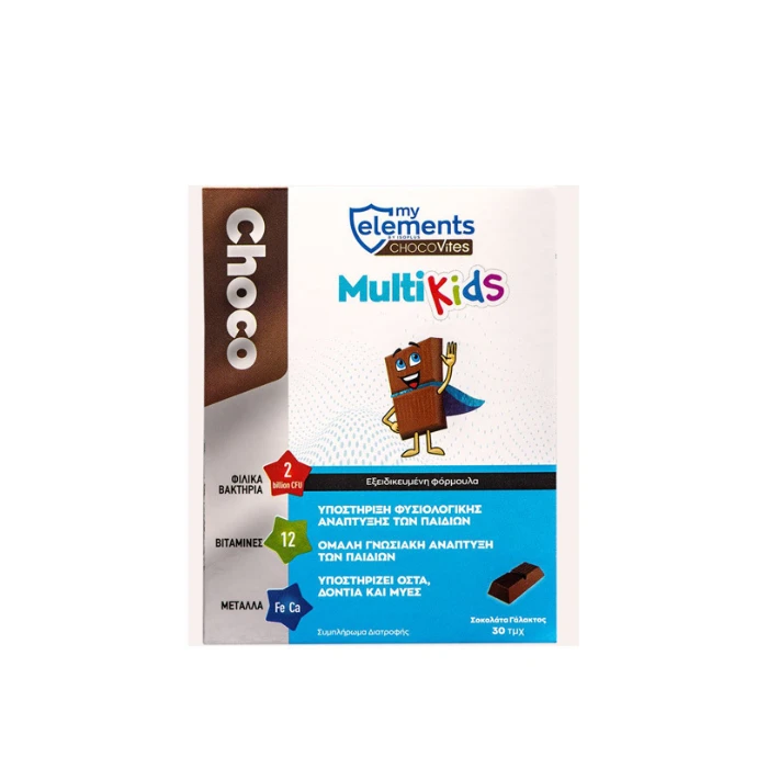 To Chocovites MultiKids της myelements είναι μια πολυβιταμίνη σε μορφή σοκολάτας, ειδικά σχεδιασμένη για παιδιά, με σκοπό να συμβάλλει στην ομαλή ανάπτυξή τους.