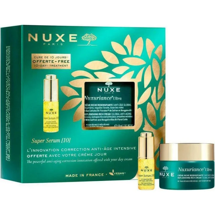 Ένα μοναδικό σετ ολικής αντιγήρανσης από την Nuxe για ξηρές και πολύ ξηρές επιδερμίδες με κρέμα ημέρας της σειράς Nuxuriance και ισχυρό αντιγηραντικό serum για αγωγή 10 ημερών.