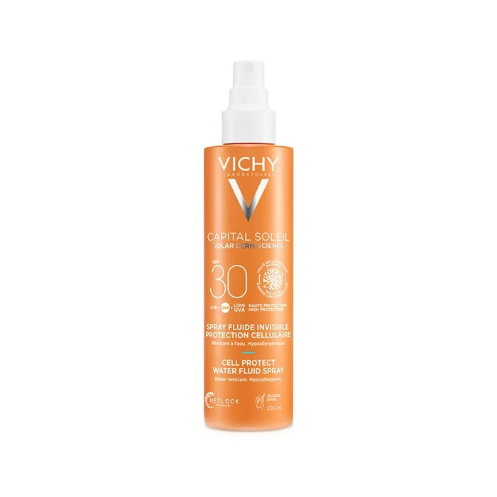 Το Vichy Capital Soleil Cell Protect Water Fluid Spray SPF30 είναι ένα αντηλιακό γαλάκτωμα για το πρόσωπο και το σώμα, το οποίο διατίθεται σε πρακτική συσκευασία σπρέι. Παρέχει πολύ υψηλή προστασία ευρέος φάσματος, χωρίς να αφήνει λευκά σημάδια και λιπαρότητα, ενώ διαθέτει υψηλή ανθεκτικότητα στο νερό.