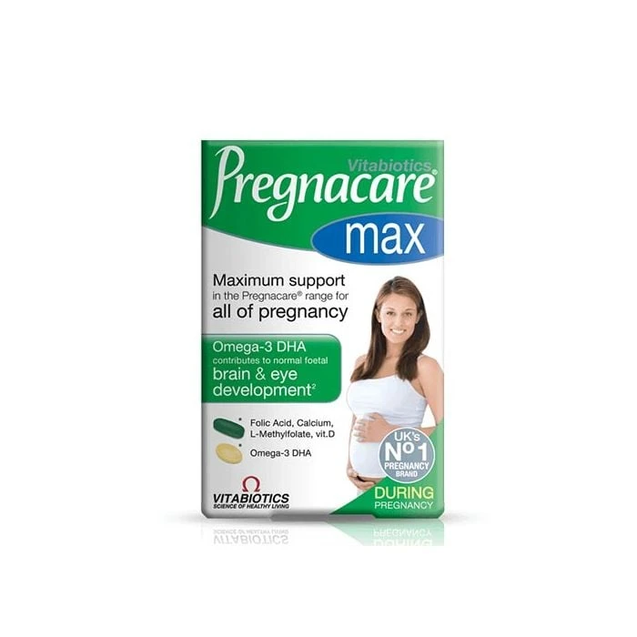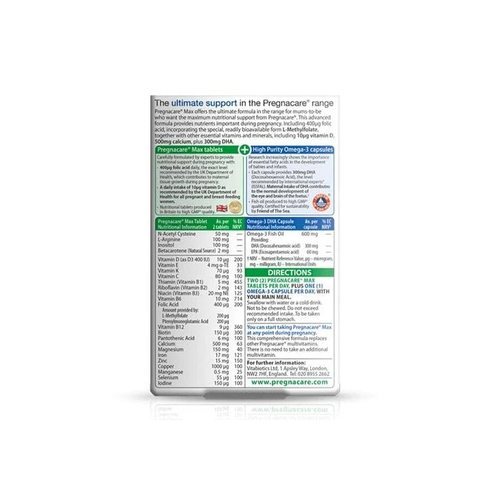 Οι κάψουλες του Pregnacare Max παρέχουν 600mg ιχθυελαίου υψηλής καθαρότητας, που είναι μια πλούσια πηγή ωμέγα-3 λιπαρών οξέων και αποδίδει 300mg DHA και 60mg EPA. Σύμφωνα με επιστημονικές μελέτες, το DHA συμβάλλει στην υγιή ανάπτυξη των ματιών και του εγκεφάλου του βρέφους και το EPA βοηθά στη διατήρηση της βέλτιστης λειτουργίας του εγκεφάλου και του νευρικού του συστήματος. Τα ωμέγα-3 λιπαρά οξέα συμβάλλουν επίσης στην καρδιαγγειακή υγεία της εγκύου.